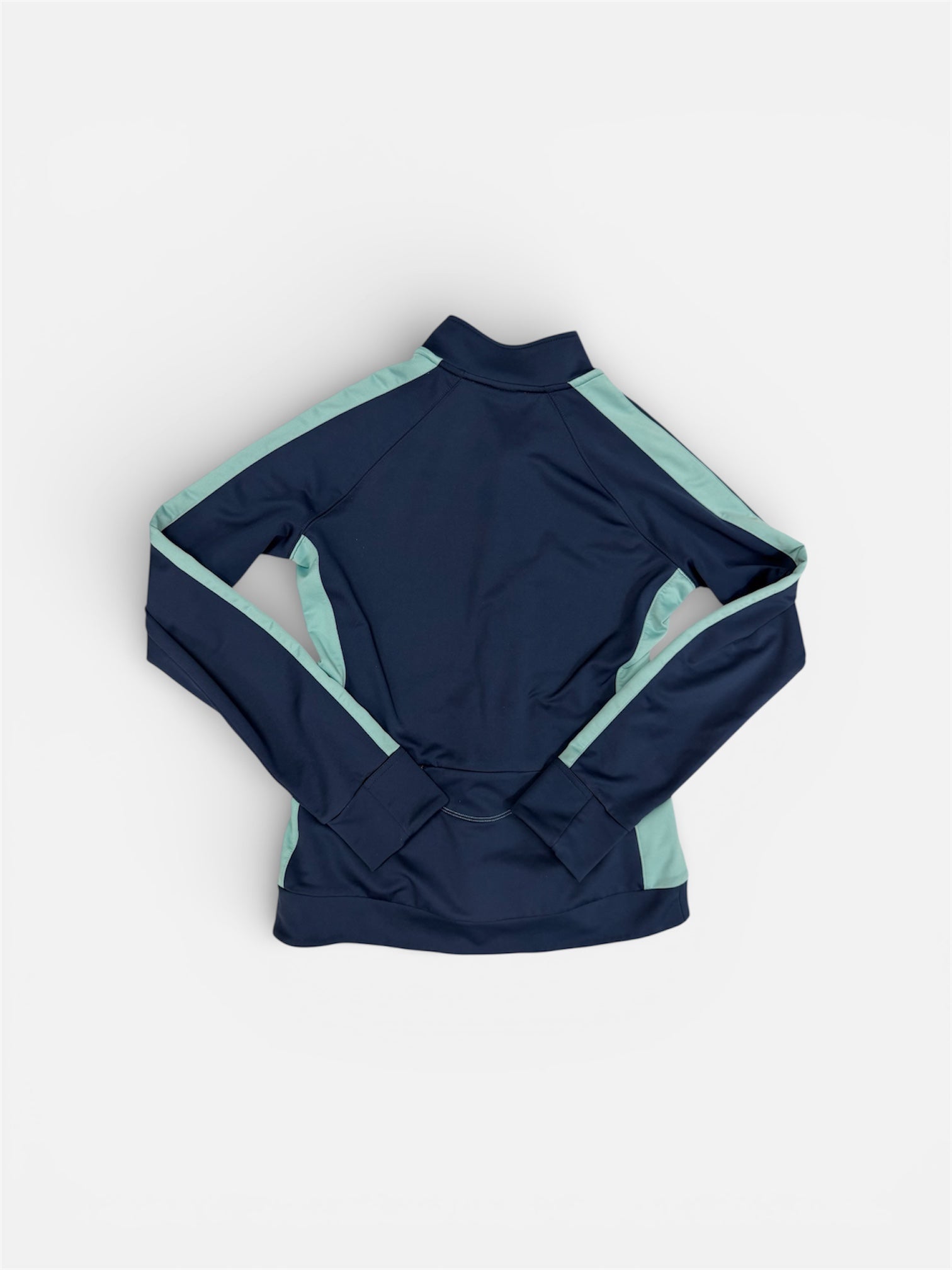 Preloved Alo jacket featuring a sleek athletic fit with contrast mint panels. Comfortable stretch fabric with zip pockets—great for workouts or everyday wear.